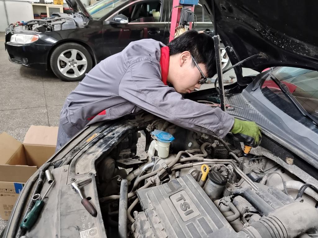 班级同学肖攀前不久刚刚从上海的汽修厂离职,目前在太仓市银华汽车修理有限公司实习,该企业的业务范围比较广,业务量也比较大。随访时,肖攀与师父正在更换帕萨特的正时皮带,师父对他的评价较高,比较肯干,头脑清楚,也反映了近些年汽修教学的提高,学生经过了专业学习与训练动手能力强,反应快。