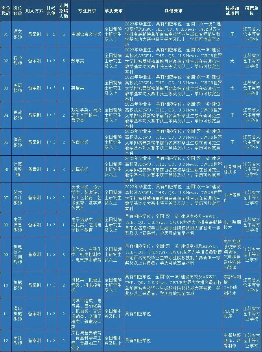 详见《2023年太仓市公开招聘备案制教师岗位信息表》,下图30名教师招聘单位为平博网页版。