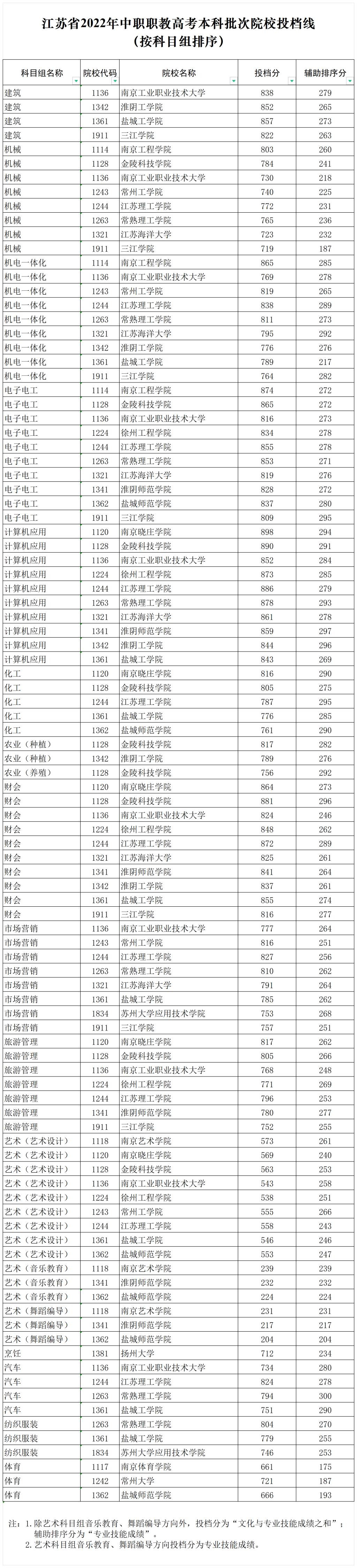 江苏省2022年中职职教高考本科批次院校投档线(按科目组排序)
