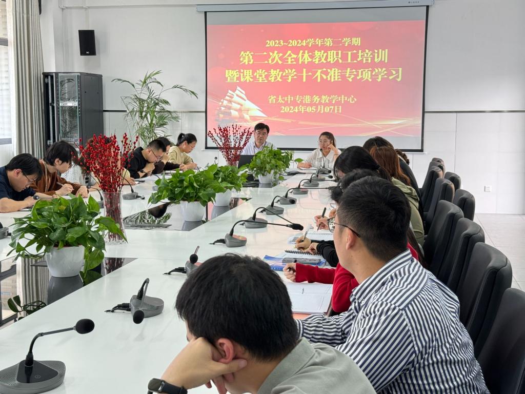 2024年5月7日,为进一步规范课堂教学要求,强调教师教书育人本职工作,港务教学中心于511会议室召开2023-2024学年第二学期第二次全体教职工培训暨课堂教学十不准专项学习,本次活动由港务教学中心主任黄振贤主持,副校长田中平、副主任张萌及港务教学中心全体教职工参与。