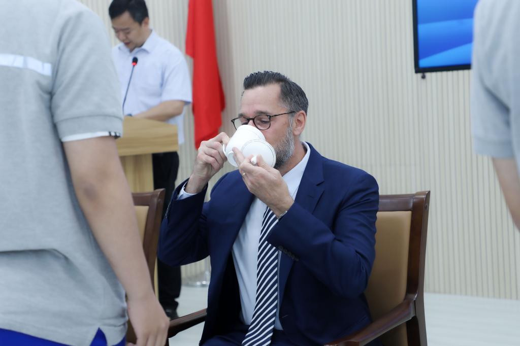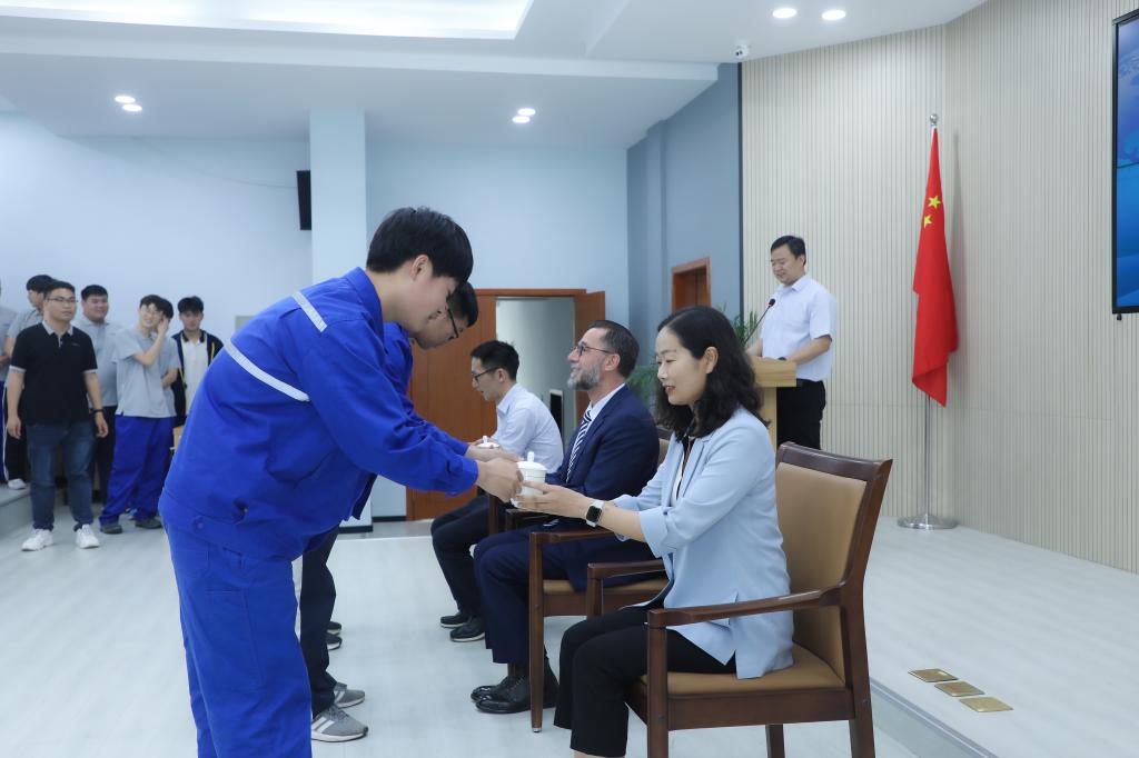 仪式上,12名学徒生手捧一杯清茶,为企业师傅敬茶,行拜师礼。