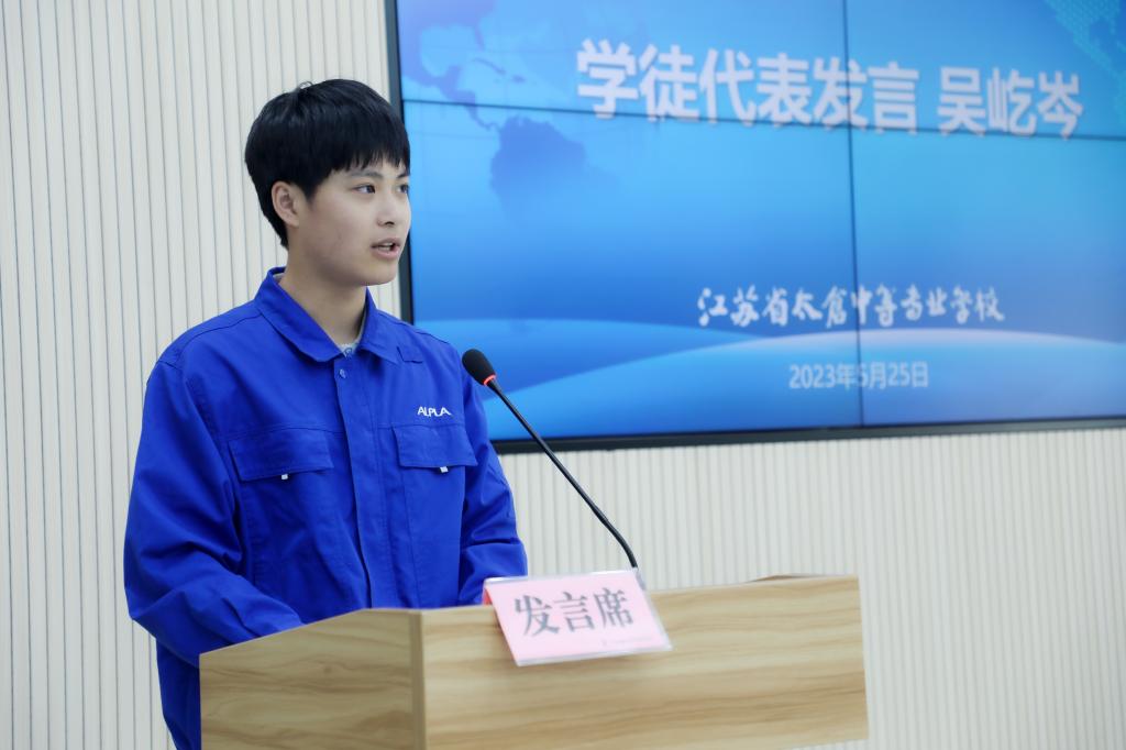 丁亮校长在致辞时表示,太仓中专现代学徒制教育已经实施二十多年,实践证明这是成功的育人方式,同学们通过企业的工作氛围、工作方式、高端技术、工艺标准和严谨的治学方式努力成为高素质技能型人才。他希望同学们要珍惜学习机会,阿普拉公司拥有先进的培训中心,完备的培训体系和严格的考核体系,努力学习,向自己的师傅多请教,从合格的学徒成长为卓越的工程师。要树立信心,未来成为阿普拉公司业务可持续发展的人才储备,成为行业的佼佼者。