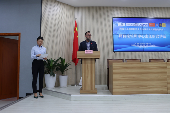 欧托凯勃汽车线束(太仓)有限公司培训中心经理汪鸣、人事专员徐冰妍,巨浪凯龙机床(太仓)有限公司培训学院经理陈晓丹,阿普拉(中国)科技有限公司培训中心主任胡安、助理赵凤、江苏区人事经理莫雅芳,百隆家具配件有限公司总经理Henry Li、人事经理施琦、生产主管张海涛、培训中心负责人汤小龙。江苏联院太仓中专办学点党委书记丁亮、副校长杜艳红、电气与汽车工程系主任王国友、机电教研室主任王苏皓、机电2352班班主任高吴嬿,2023级五年制高职机电专业学徒生及家长和2024级五年制高职机电专业全体同学参加了签约仪式,仪式由电气与汽车工程系副主任刘天雄主持。
