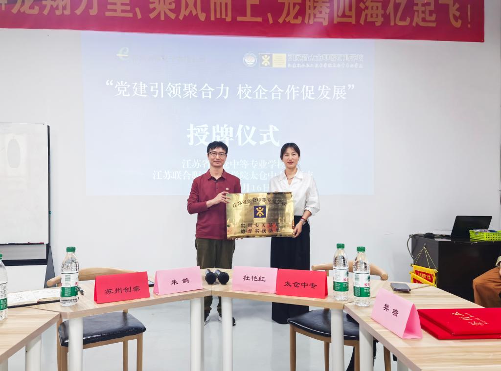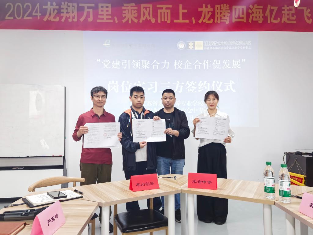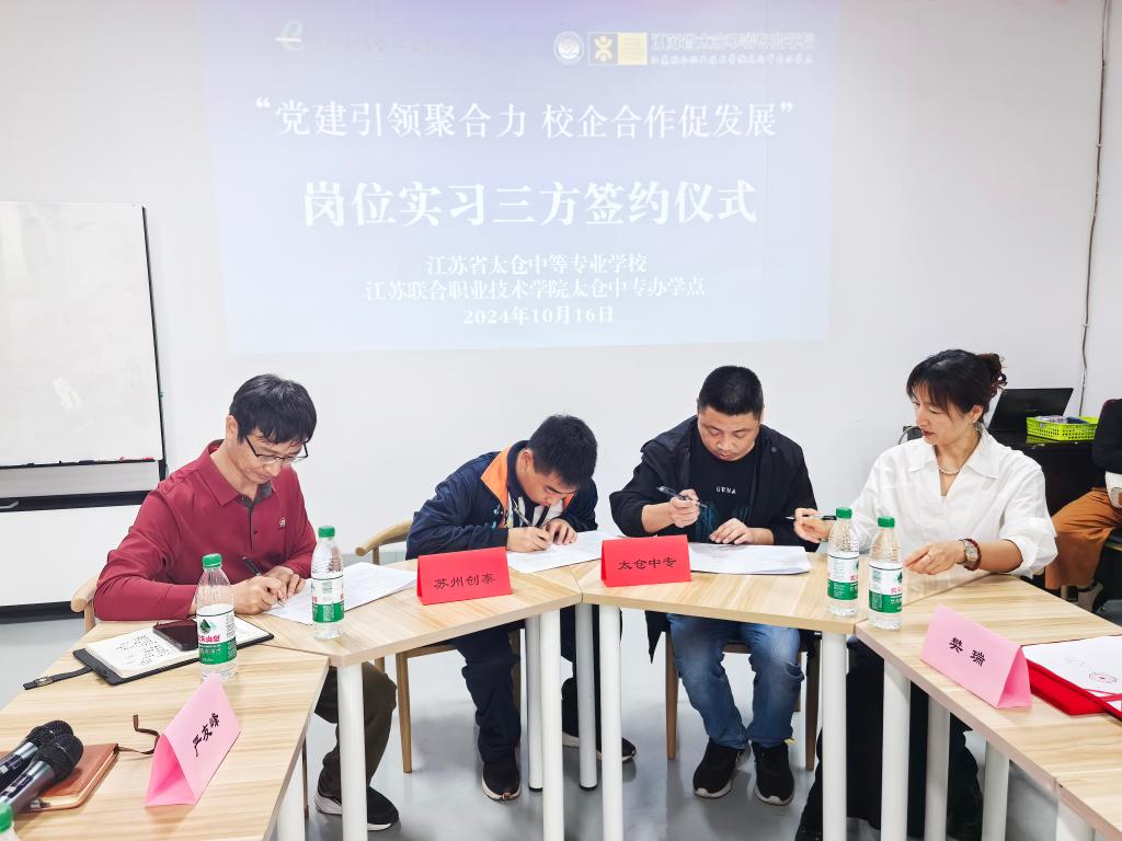 苏州创泰电子有限公司总经理朱鸽,生产经理严友峰,营销经理赵静,管理部经理朱婷婷等企业领导,太仓中专副校长杜艳红、电气与汽车工程系主任王国友、副主任刘天雄、机电教研室主任王苏皓、班主任王秋琴、樊瑞和张小慧及4位同学和家长,共同出席了签约仪式。