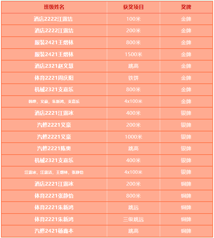 从基本功训练到实战磨合,学校田径队的队员们通过前期充分训练及太仓市中小学阳光体育联赛和省职业学校田径运动会的洗礼,早已摩拳擦掌,蓄势待发。比赛当天,雨丝绵绵,却未能阻挡住12位省太中专田径健儿追梦的脚步。他们以汗水为墨,以坚韧为笔,在湿漉漉的跑道上绘就了一幅幅动人的画卷。令人兴奋的是,我校运动员打破五项赛会纪录,酒店2222江露洁同学更是在女子100与200米项目上均达到国家一级运动员水平。