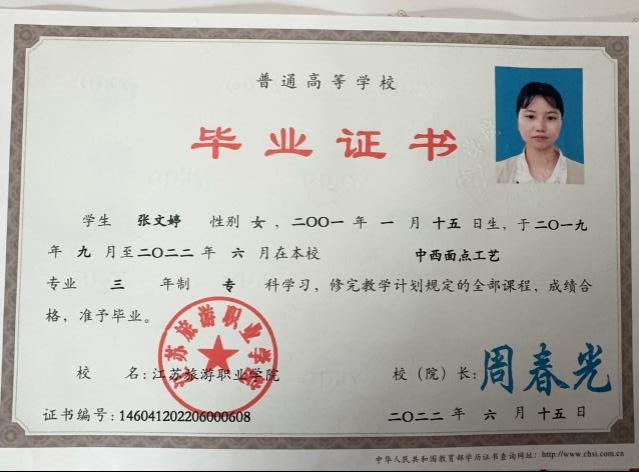 毕业后,张文婷在积累实践经验的同时,继续深造学业,考入江苏旅游职业学院。专科学习期间,她以优异成绩获得“优秀毕业生”称号,并于2022年成功取得专科学历,为职业发展奠定坚实基础。