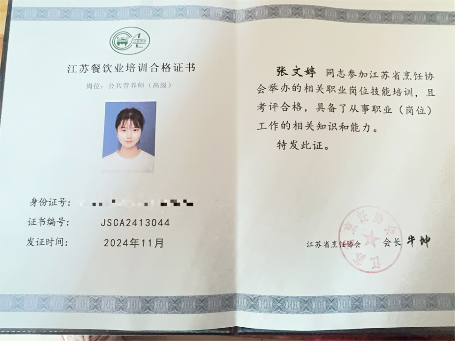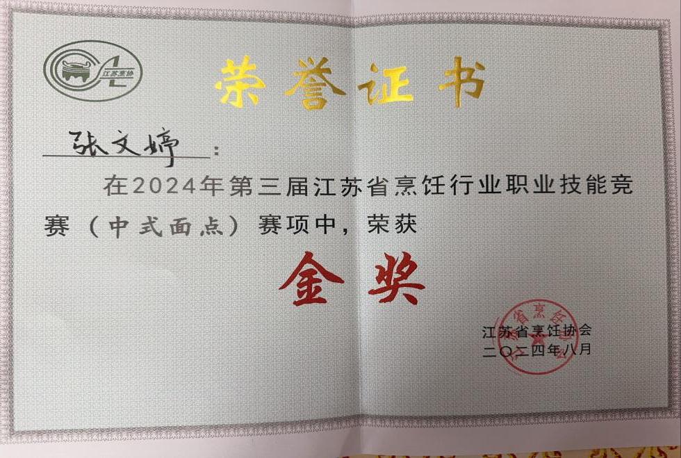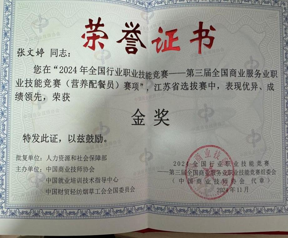 在职期间,张文婷始终保持学习热情,积极参与各类职业技能竞赛。她先后斩获面点金奖和营养配餐员金奖,其中在第三届江苏省营养配餐员选拔赛中荣获金奖,并成功晋级全国比赛。此外,她还通过不懈努力,获得公共营养师高级证书,实现了职业技能的全面提升。