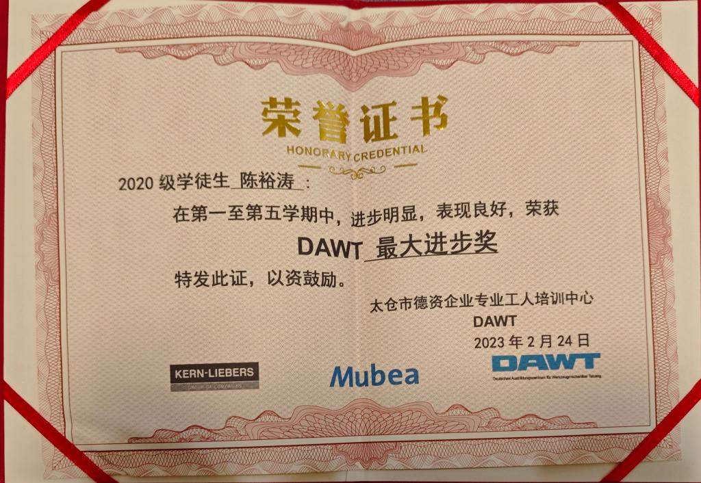 2020年中考失利后,我面临了人生中的第一次选择,一是回老家和亲戚学汽修,学成后在父母的汽修店里帮忙,二是继续复读重新备考。我不想回老家,外加高中的录取分数线让我望而生却,但从小就喜欢动手的我,偶然从亲戚那听说了DAWT中德合作培养,既学习理论知识,又培养我们的动手实践能力,我感觉这样的培养方式挺适合我的,于是我和父母商量后,我选择留在太仓,并报名了太仓德资企业专业工人培训中心中德双元制合作班。通过了由企业-学校-DAWT组织的笔试,实操和面试,并与DAWT签订了学徒培养协议,我成为了一位名副其实的双元制学徒生。