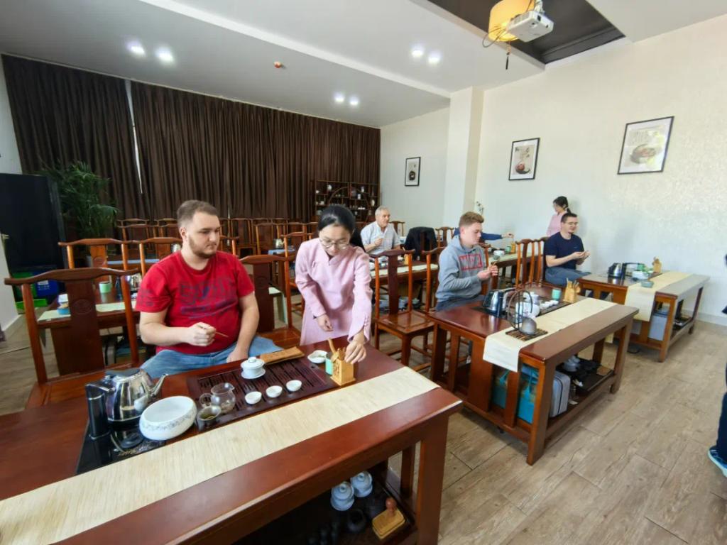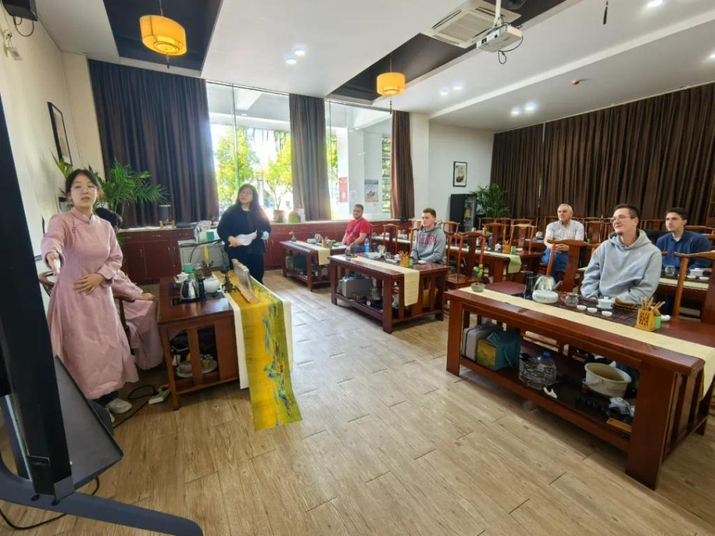 为增进双方的文化交流,茶艺社成员为德国师生们带来了一次茶艺体验课程。在古色古香的氛围中,茶艺社成员向德国师生详细介绍了中国丰富多样的茶叶种类以及蕴含深厚文化底蕴的茶道精神,向他们展示了中国茶文化的博大精深。从茶叶的识别、冲泡技巧到品鉴艺术,每一步都充满了仪式感。德国师生们在茶艺社成员的指导下,亲手泡制了一壶壶清香四溢的茶水,不仅学会了茶艺的基本礼仪,更深刻体会到了茶道中蕴含的和谐与宁静。