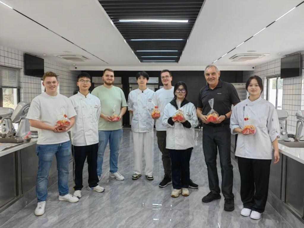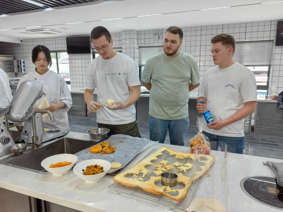 紧接着,来访团移步至西点实训室,一场关于“肉松小贝”的西点制作体验等待着他们。在宽敞明亮的实训室中,西点老师详细讲解了制作步骤和技巧,从原料的准备到烘焙的过程,每一步都耐心指导。德国师生们兴奋地穿上厨师服,亲手搅拌面糊、包裹肉松、涂抹酱料,最终一个个金黄诱人的肉松小贝在他们的巧手下诞生。活动结束后,德国师生们对于课堂内容与制作过程印象深刻,对烹饪成果也给予了积极的反馈。